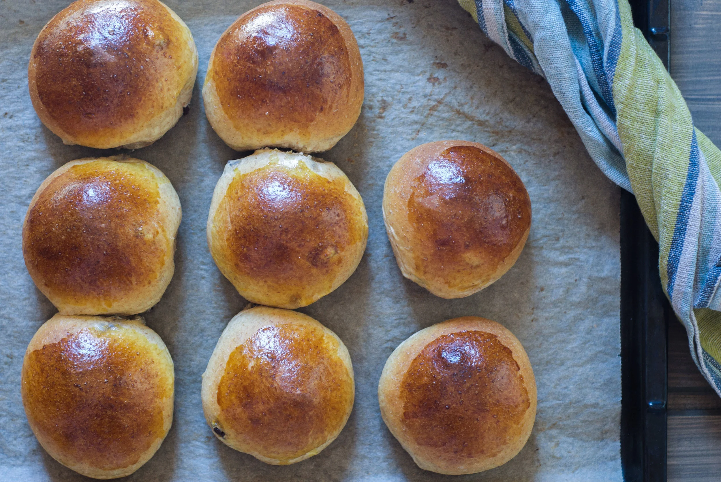 La bollene stå i fred i minst 30 minutter, til du ser de har hevet godt. Pensle med sammenpisket egg og stek i omtrent 12 minutter. Følg med mot slutten så ikke bollene blir for godt stekt.