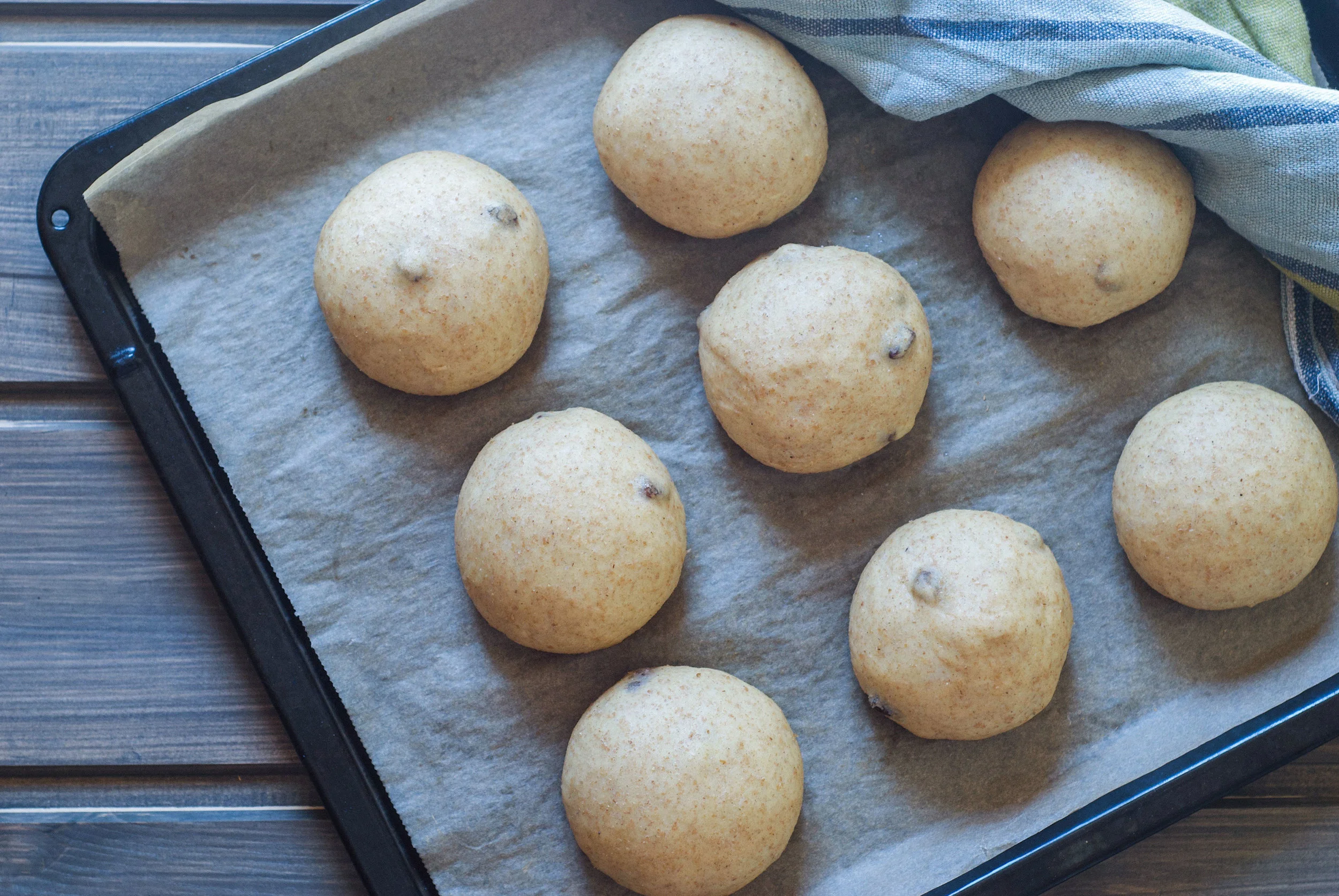 Rull ut til boller og legg på et stekebrett med bakepapir. Dekk med plastikk, eller spray forsiktig med litt vann og legg et kjøkkenhåndkle over - slik at ikke overflaten på bollene tørker ut.